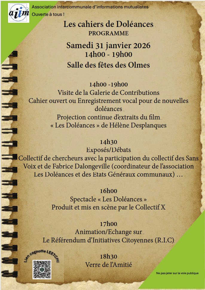 Le premier temps d’échange s’est déroulé dans le Rhône, le 31 janvier, dans la commune de Les Olmes, à l’invitation de l’Association intercommunale d’information mutualiste, dans une salle municipale, avec la lecture de doléances par le Collectif X de Saint-Étienne, qui a donné à la rencontre une profondeur sensible et incarnée. Ce temps a également été marqué par le travail remarquable de l’historien François Robert, membre du laboratoire de sciences politiques Triangle (CNRS – ENS Lyon), avec qui se noue aujourd’hui une complicité intellectuelle et citoyenne particulièrement stimulante autour de la lecture politique et historique des doléances.