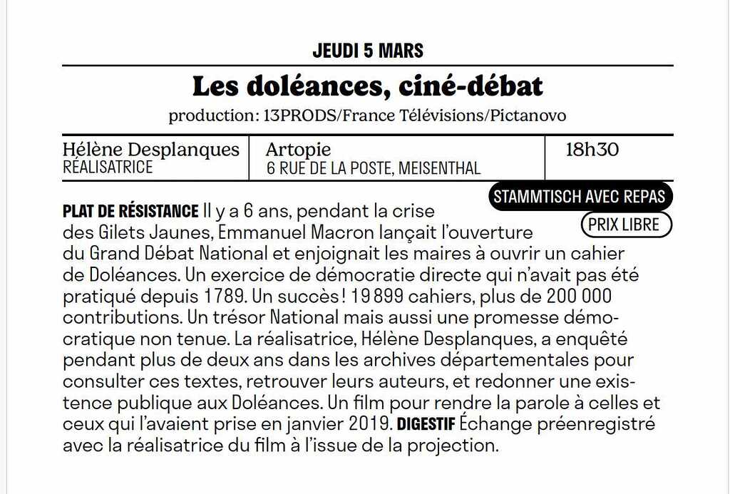 🎭 Une représentation théâtrale, pour entendre les doléances de 2019 🍻 Un temps convivial autour d’une buvette et d’un repas partagé, pour écrire ensemble les doléances d’aujourd’hui 📣 Une criée publique, pour mettre en voix les paroles récoltées