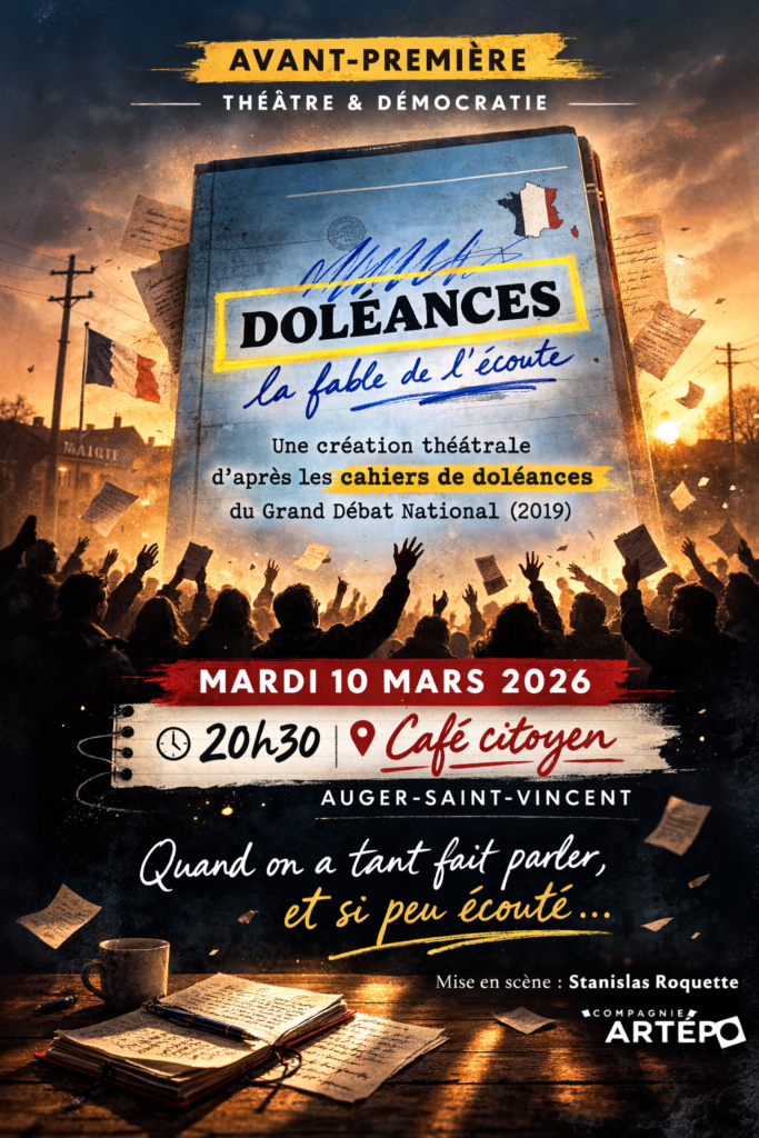 Le mardi 10 mars 2026 à 20h30, le Café citoyen d’Auger-Saint-Vincent accueille l’avant-première de DOLÉANCES – La fable de l’écoute, une création théâtrale puissante et profondément politique, portée par la Compagnie Artépo et mise en scène par Stanislas Roquette.