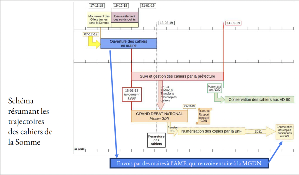L’analyse chronologique fait apparaître plusieurs séquences dans ce moment démocratique. De nombreux cahiers sont ouverts dès décembre 2018, souvent à l’initiative de citoyens ou de maires. Mais le 15 janvier 2019 marque une date charnière avec le lancement officiel du Grand débat national, qui entraîne une seconde vague d’ouverture de cahiers et modifie leur cadre institutionnel. Les cahiers deviennent alors un point de rencontre entre plusieurs formes de mobilisation : les ronds-points des Gilets jaunes, les manifestations, les réunions publiques locales et les dispositifs du débat national.